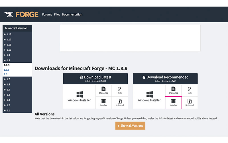 2.MODが対応しているマインクラフトのバージョン(今回のComputer Craft Eduは1.8.9)を選択して、installerをクリックします。