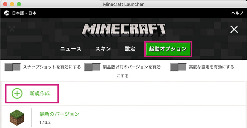 5.マインクラフトランチャーを起動して、「起動オプション」ボタンをクリックし、「新規作成」ボタンをクリックします。