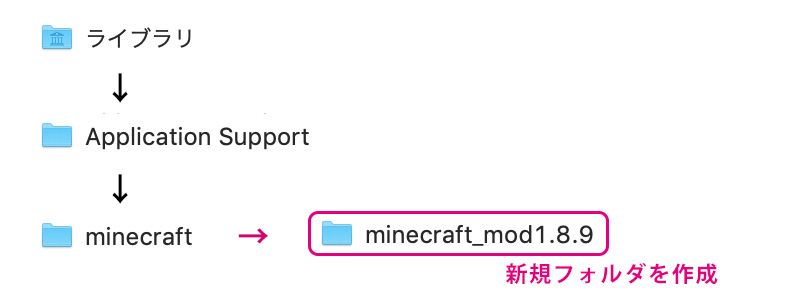Finderで「ライブラリー」→「Application」→「minecraft」の中に「minecraft_mod1.8.9」と名前をつけてファイルを新規作成します。