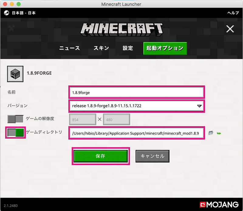7.マインクラフトランチャーに戻り、名前(新しい名前「1.8.9forge」など)、バージョン(forge 1.8.9を選択)、ゲームディレクトリ(先ほど新規作成したファイル「minecraft_mod1.8.9」と入力)を写真のように設定します。