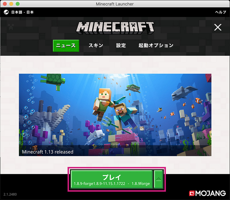 「プレイ」ボタンの右の▲をクリックして、先ほど設定した起動オプション「1.8.9forge」を選択します。