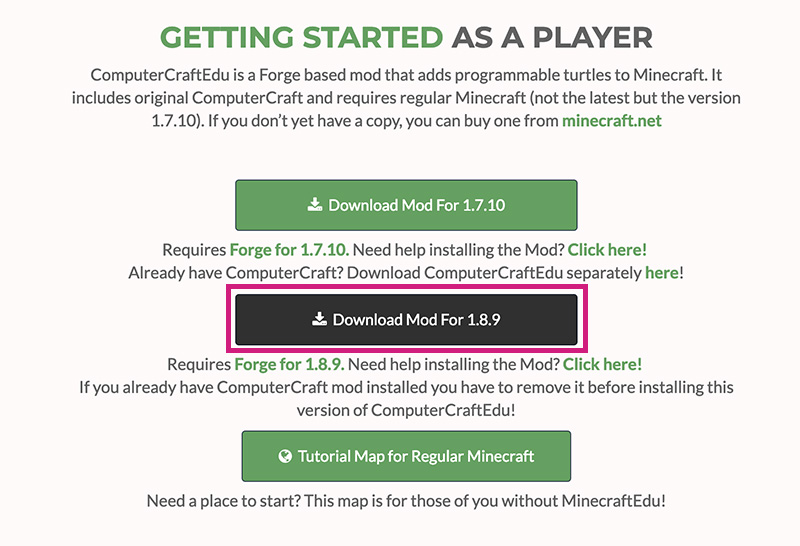 1.ダウンロードページ(https://computercraftedu.com/)にアクセスして、Computer Craft EduのMODをダウンロードします。