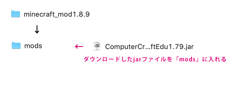 5.ダウンロードしたjarファイルを先ほど作った、「minecraft_mod1.8.9」内の「mods」ファイルに入れます。